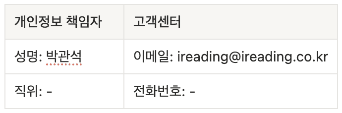 아이리딩(이하 “회사”)은 개인정보 보호에 관한 법률을 준수하고 있으며, 이용자의 개인정보가 보호받을 수 있도록 최선을 다하고 있습니다. 이에 『개인정보 보호법』에 따라 개인정보 처리에 관한 절차 및 기준을 안내하고, 이와 관련한 고충을 신속하고 원활하게 처리할 수 있도록 하기 위하여 다음과 같이 개인정보처리방침을 수립·공개합니다.